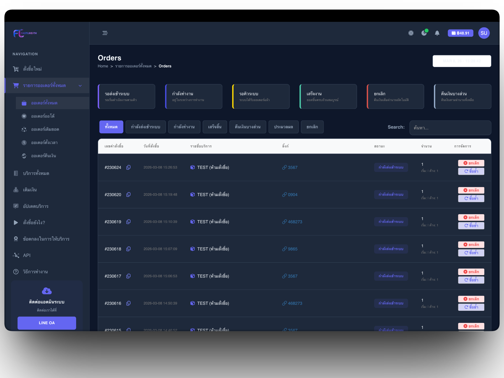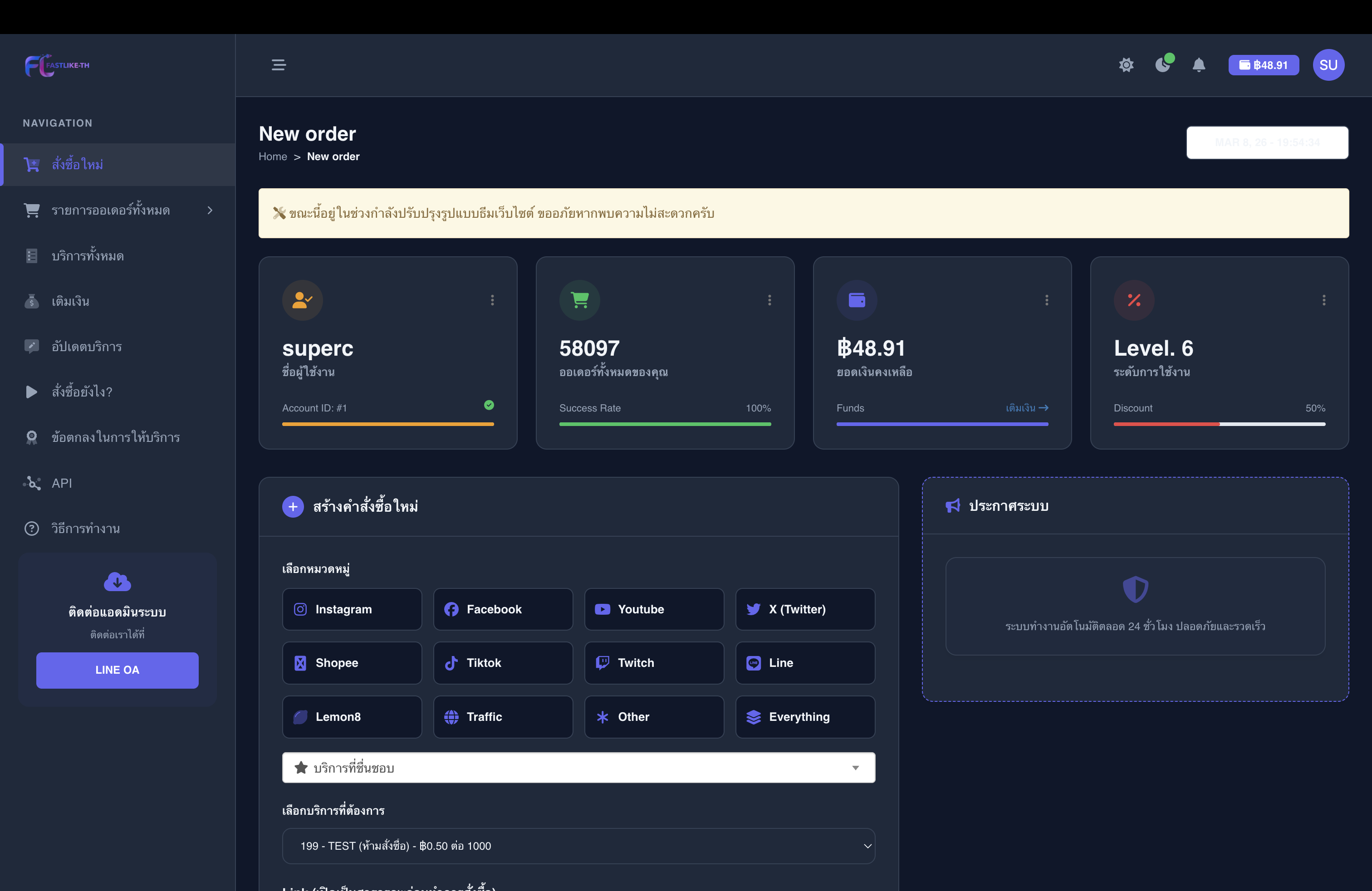 ทีมงานและแอดมินพร้อมดูแลผู้ใช้งาน หากพบปัญหาเกี่ยวกับคำสั่งซื้อ การเติมเงิน หรือการใช้งานระบบ สามารถติดต่อสอบถามได้ทันทีผ่าน LINE Official ของเรา