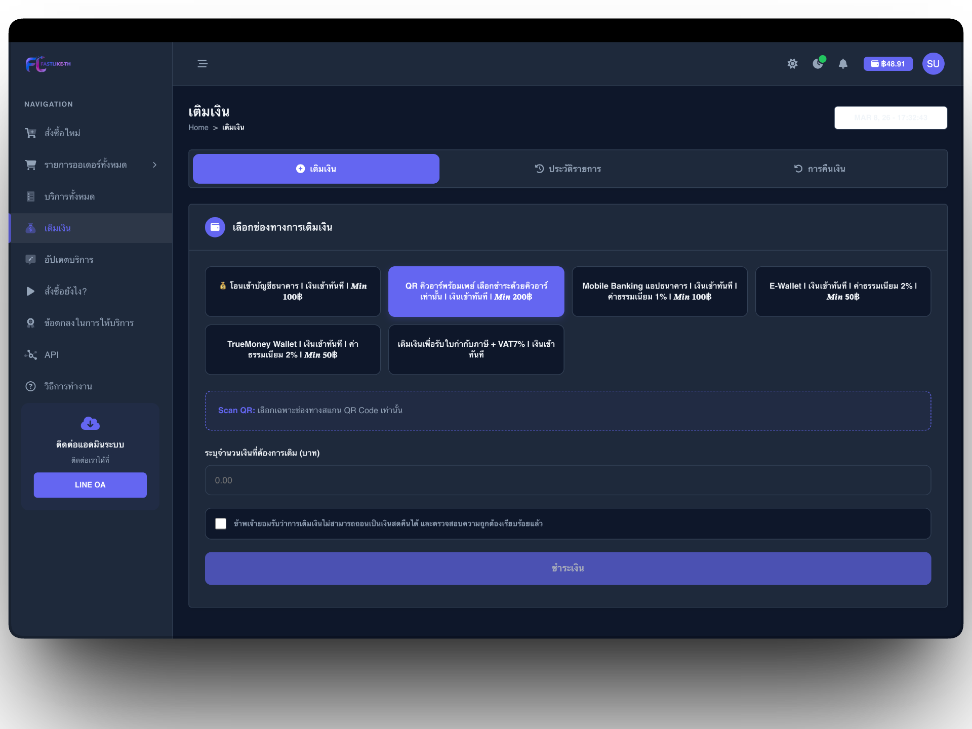 ระบบเติมเงินอัตโนมัติทันที รองรับ QrCode, Mobile Banking, ShopeePay, TrueMoney Wallet, LINE Pay รวมถึงการโอนผ่านบัญชีธนาคาร และช่องทางที่สามารถออกใบกำกับภาษีเต็มรูปแบบได้